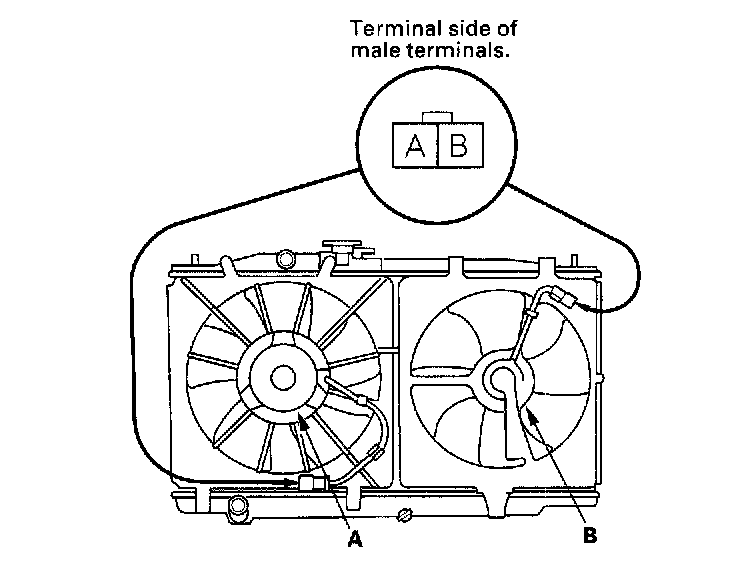 Test1. Disconnect the 2P connectors from the radiator fan motor (A) and condenser fan motor (B).