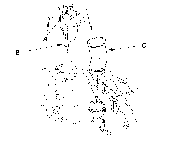 5. Remove the clips (A), then remove the air intake cover (B) and the air intake tube or duct (C).