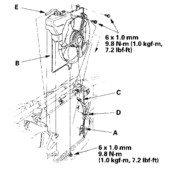 6. Remove the compressor clutch connector (A) from the condenser fan shroud (B). Disconnect the condenser fan connector (C), then remove the wire harness clip (D) from the condenser fan shroud. Remove the hose (E) from the radiator. Loosen the lower mounting bolts, then remove the upper mounting bolts and the condenser fan shroud. Be careful not to damage the radiator fins when removing the condenser fan shroud.