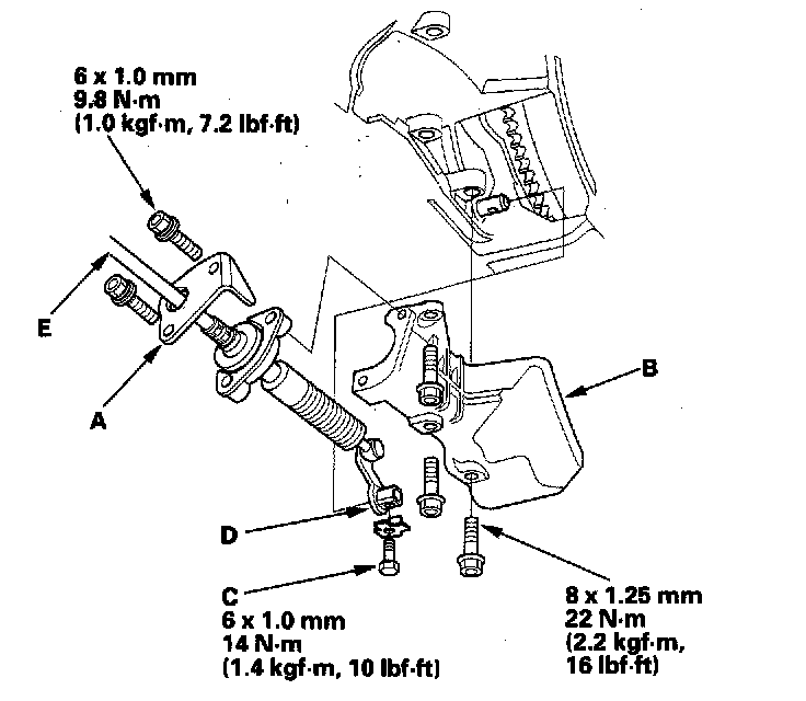 9. Remove the lock bolt (C) securing the control lever (D), then remove the shift cable (E) and the control lever. Do not bend the shift cable excessively.