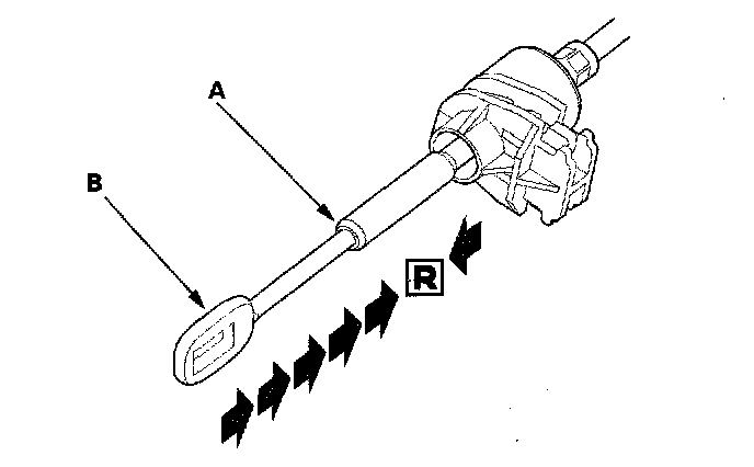 18. If necessary, push the shift cable until it stops, then release it. Pull the shift cable back one step so that the shift position is in R. Do not hold the shift cable guide (A) to adjust the shift cable (B).