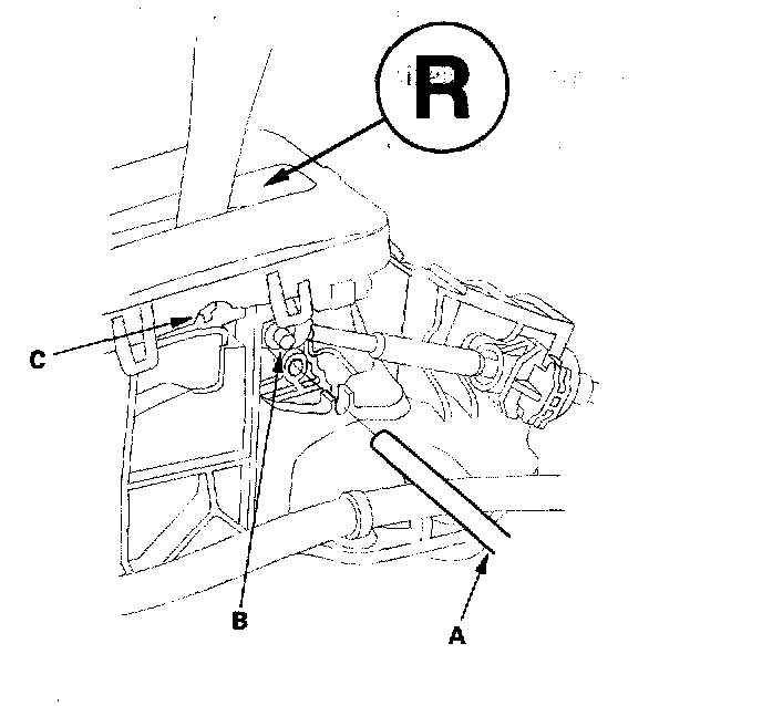 20. Insert a step 6.0 mm (0.24 inch) pin (A) through the positioning hole (B) on the shift lever bracket base and into the positioning hole (C) on the shift lever. The shift lever is secured in the R position.