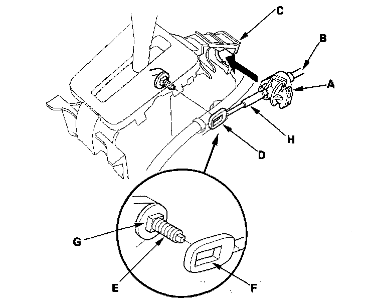 21. Align the socket holder (A) on the shift cable (B) with the slot in the bracket base (C), then slide the holder into base. Install the shift cable end (D) over the mounting stud (E) by aligning its square hole (F) with the square fitting (G) at the bottom of the stud. Push the holder until it snaps securely in place. Do not install the shift cable by holding the shift cable guide (H).
