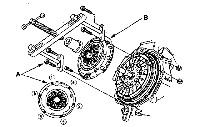 8. Be careful not to damage the pressure plate (A). Tighten (180 degrees apart) the pressure plate mounting bolts (B) in a star pattern in several steps.