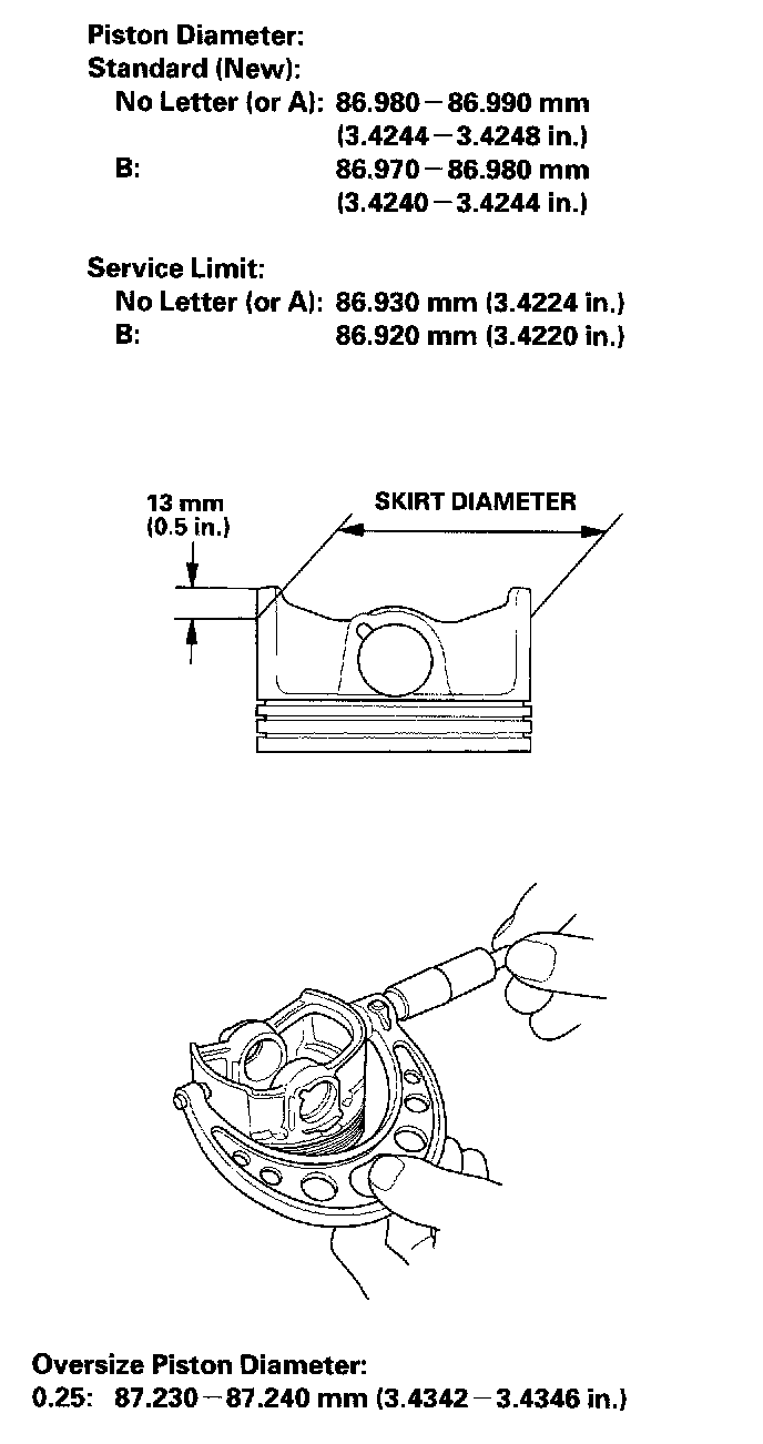 3. Measure the piston diameter at a point 13 mm (0.5 inch) from the bottom of the skirt. There are two standard-size pistons (No Letter or A, and B). The letter is stamped on the top of the piston. Letters are also stamped on the block as cylinder bore sizes.