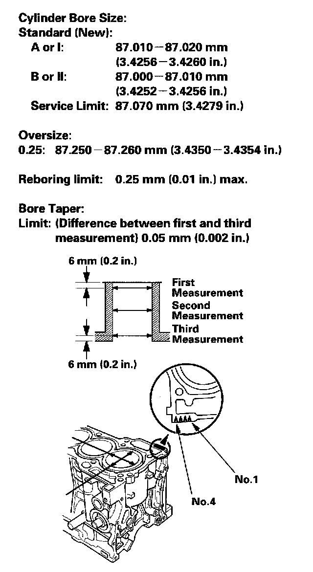 4. If scoring or scratches are still present in the cylinder bores after honing to the service limit, rebore the cylinder block. Some light vertical scoring and scratching is acceptable if it is not deep enough to catch your fingernail, and does not run the full length of the bore.