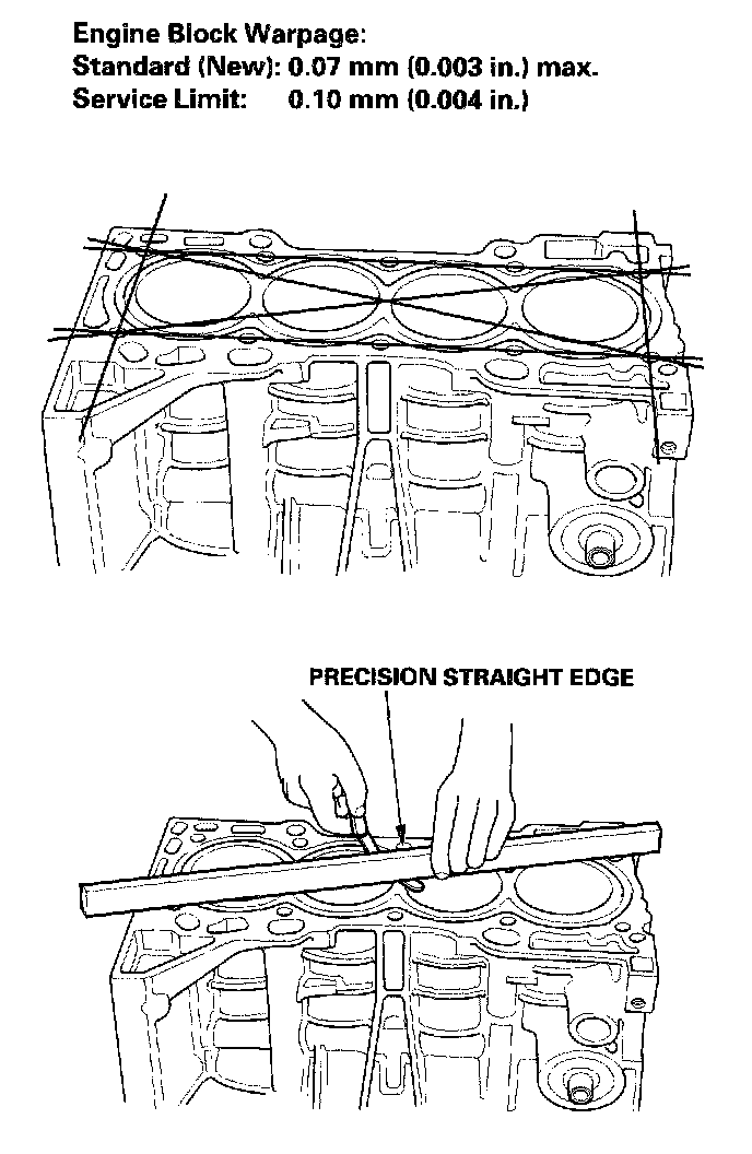 6. Check the top of the block for warpage. Measure along the edges and across the center as shown.