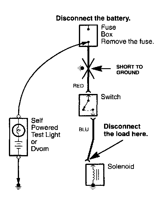 5. If the self-powered test light goes on or the DVOM displays a low reading or no reading (zero), there is a short to ground in the wiring near that point.