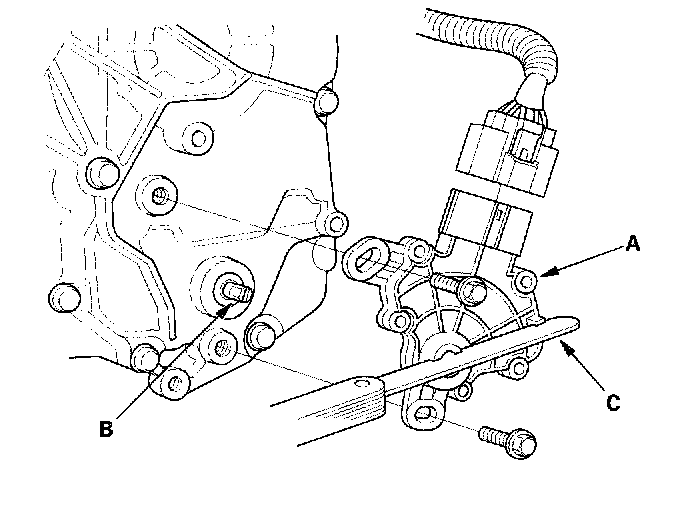7. Align the cutout (A) on the rotary-frame with the neutral positioning cutouts (B) on the transmission range switch (C), then put a 2.0 mm (0.08 inch) feeler gauge blade (D) in the cutouts to hold it in the position.