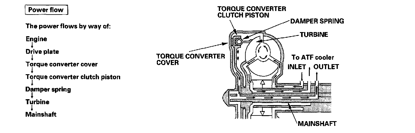 Lock-up SystemThe lock-up mechanism of the torque converter clutch operates in the D position (2nd, 3rd and 4th) and the D position over drive off mode (3rd). The pressurized fluid is drained from the back of the torque converter through a fluid passage, causing the torque converter clutch piston to be held against the torque converter cover. As this takes place, the mainshaft rotates at the same speed as the engine crankshaft. Together with the hydraulic control, the PCM optimizes the timing and amount of the lock-up mechanism. When shift solenoid valve E is turned on by the PCM, the shim solenoid valve E pressure switches the lock-up shift valve lock-up on and off. The A/T clutch pressure control solenoid valve A and the lock-up control valve control the amount of lock-up.