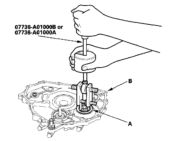 1. Remove the idler gear shaft bearing (A) from the end cover (B) with the special tool.