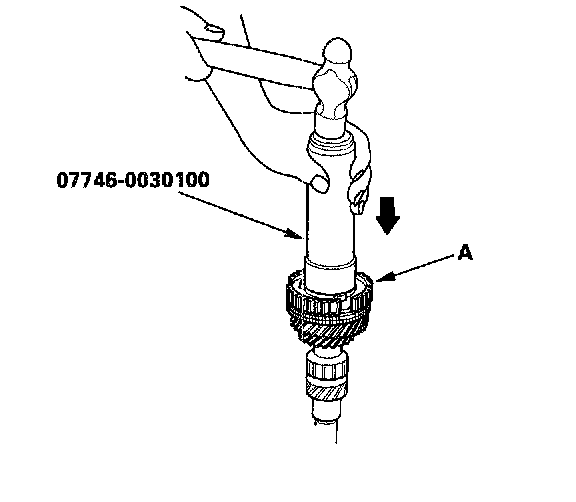 3. Support the 3rd gear (A) on steel blocks, and press the mainshaft out of the 3rd/4th synchro hub (B). Use of a jaw-type puller can damage the gear teeth.