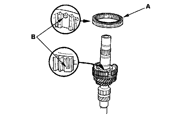 6. Install the 3rd/4th synchro sleeve (A) by aligning the stops (B) with the 3rd/4th synchro sleeve and hub. After installing, check the operation of the 3rd/ 4th synchro hub set.