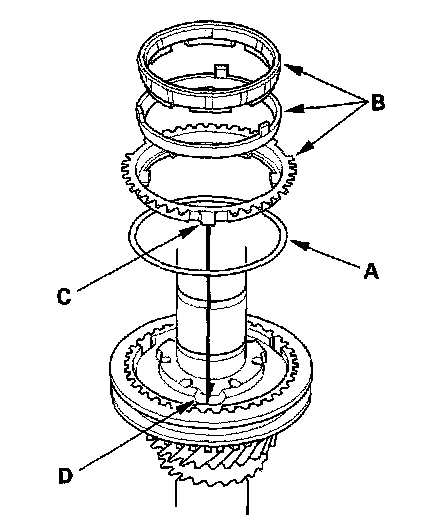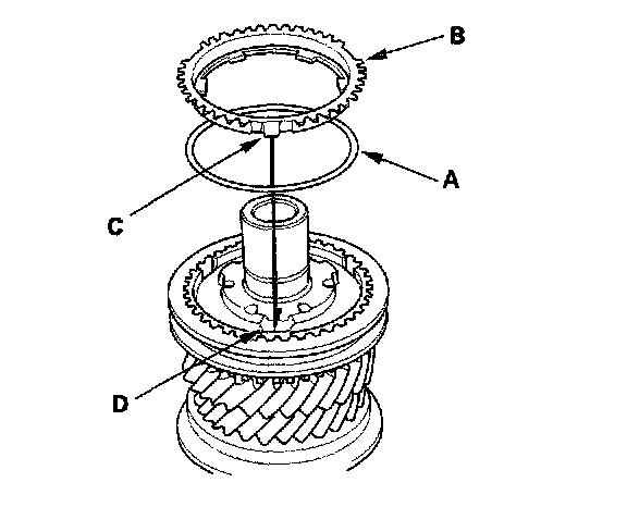 3. Install the double cone synchro assembly (A) by aligning the synchro cone fingers (B) with the holes in 3rd gear (C), then install the synchro spring (D).