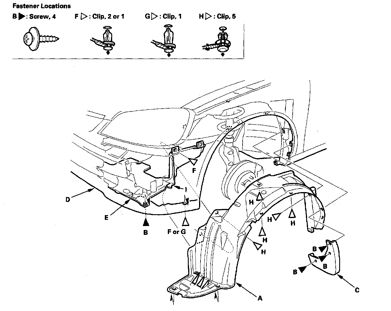 3. From the wheel arch, remove the clips (F, H) securing the front inner fender (and splash shield) on the body.