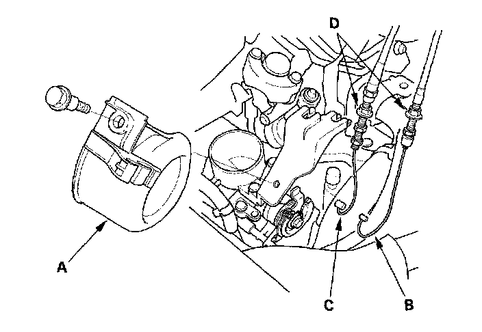 3. Remove the throttle cover (A). Fully open the throttle link and cruise control link by hand, then remove the throttle cable (B) and cruise control cable (C) from the links. Loosen the locknuts (D), and remove the cables from the bracket.