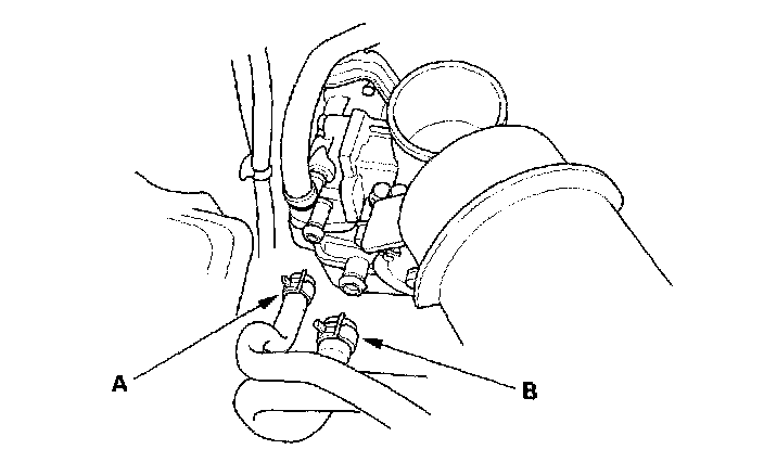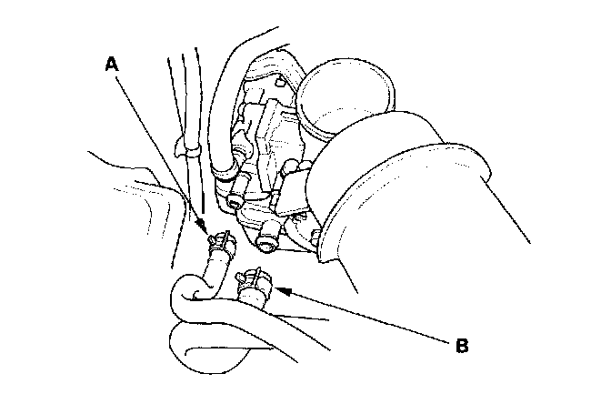 8. Install the water bypass hose (A) and brake booster vacuum hose (B).