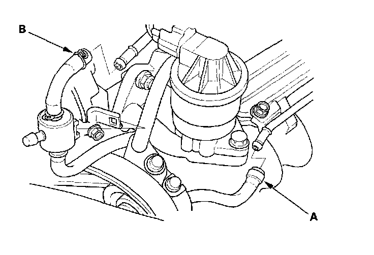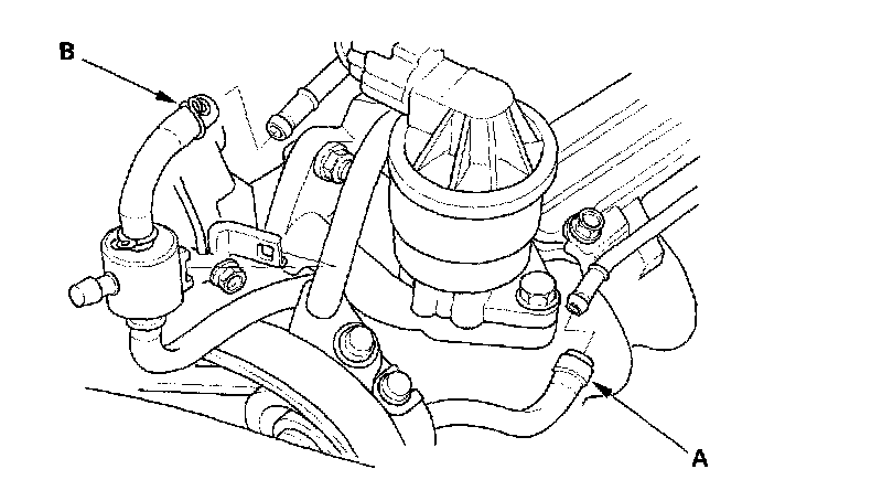 7. Install the water bypass hose (A) and evaporative emission (EVAP) canister hose (B).