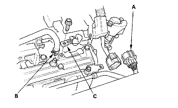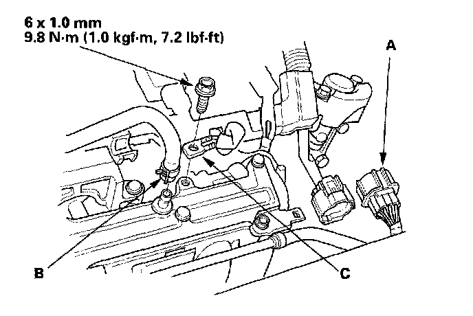 8. Disconnect the intake manifold subharness connector (A), and remove the positive crankcase ventilation (PCV) hose (B) and ground cable (C).