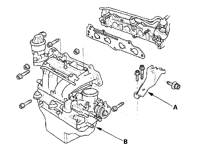 12. Remove the throttle cable bracket (A), then remove the intake manifold (B).
