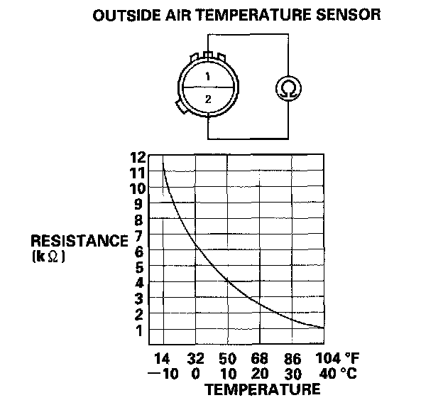 Compare the resistance reading between the No.1 and No.2 terminals of the outside air temperature sensor with the specifications shown in the graph; the resistance should be within the specifications.