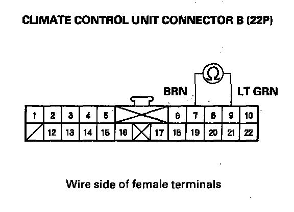 18. Measure the resistance of the evaporator temperature sensor between the No. 7 and No. 9 terminals of climate control unit connector B (22P).