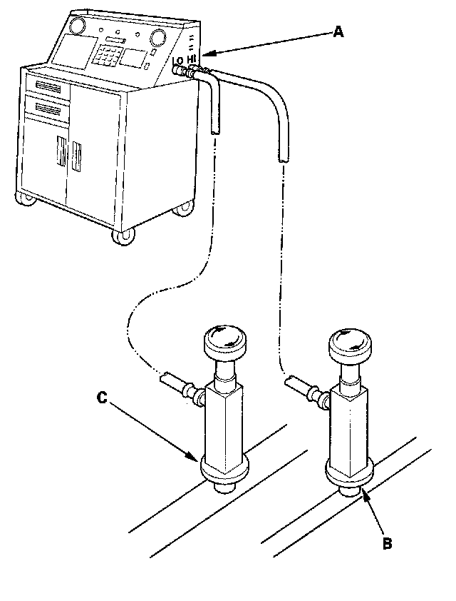 1. Connect a R-134a refrigerant recovery/recycling/charging station (A) to the high-pressure service port (B) and the low-pressure service port (C), as shown, following the equipment manufacturer's instructions.