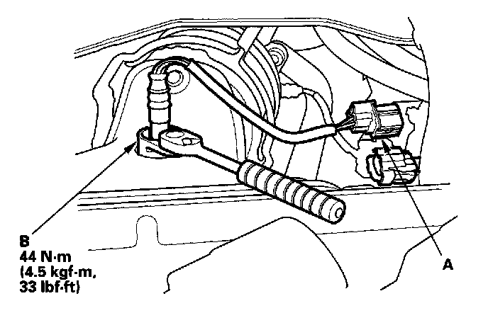 1. Disconnect the A/F sensor 4P connector (A), then remove the A/F sensor (B).