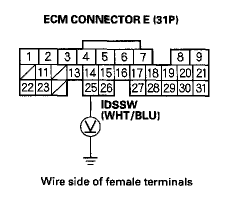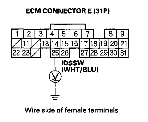 6. Measure voltage between ECM connector terminal E25 and body ground.