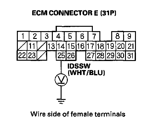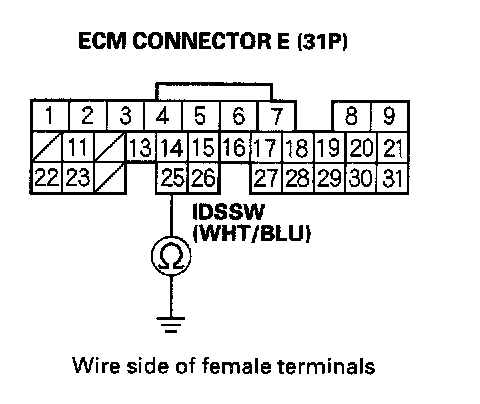 14. Check for continuity between ECM connector terminal E25 and body ground.