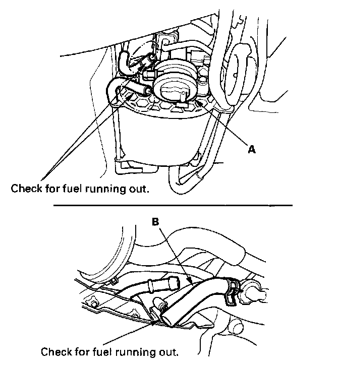 9. Fill the fuel tank with fuel, then check for fuel in the EVAP two way valve (A), and fuel tank vapor recirculation hose (B).