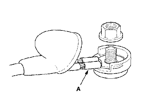 7. Install the starter in the reverse order of removal. Make sure the crimped side of the ring terminal (A) is facing out.
