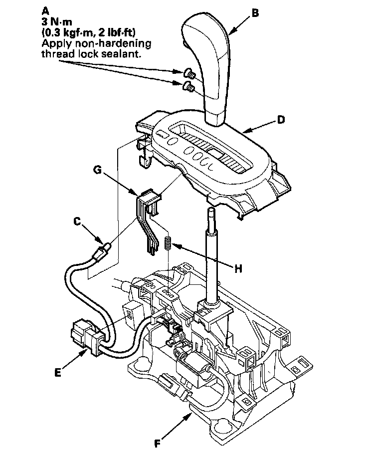 6. Remove the shift lock release (G) and spring (H).