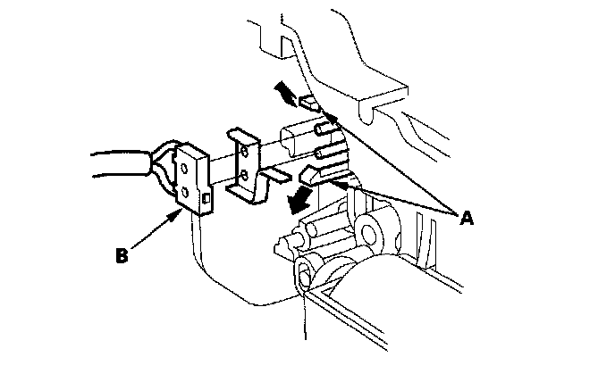 7. Open the lock tabs (A) on the shift lever bracket base, then remove the park pin switch (B).
