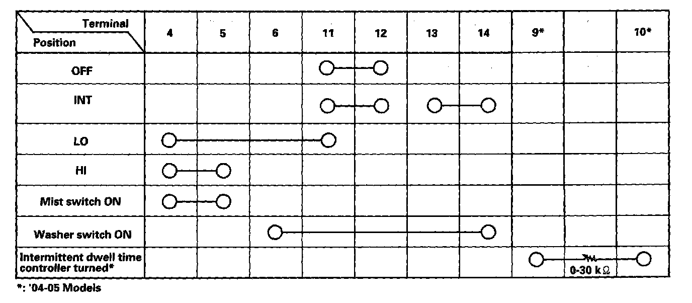 - If the terminals look OK, check for continuity between the terminals in each switch position according to the tables.