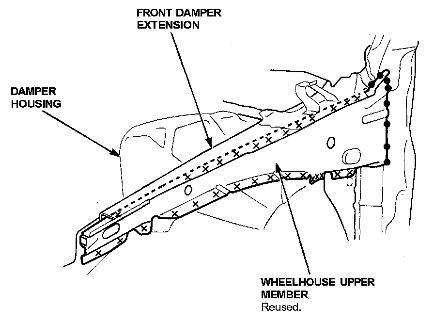 - Check the front damper extension and damper housing position, and check for damage. If necessary, remove the wheelhouse upper member, and replace the damper housing and front damper extension as an assembly, if possible.