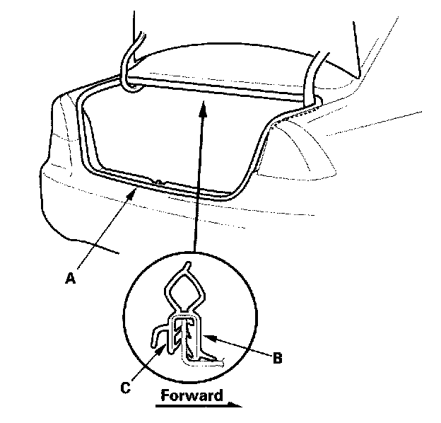 2. Locate the painted alignment mark (B or C) on the trunk lid weatherstrip. Align the painted mark with the alignment tab in the center of the trunk, and install the weatherstrip. Make sure it's seated completely and facing in the direction shown. Make sure there are no wrinkles in the weatherstrip.