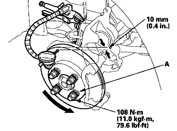 4. Install suitable flat washers (A) and wheel nuts, and tighten the nuts to the specified torque to hold the brake disc securely against the hub.