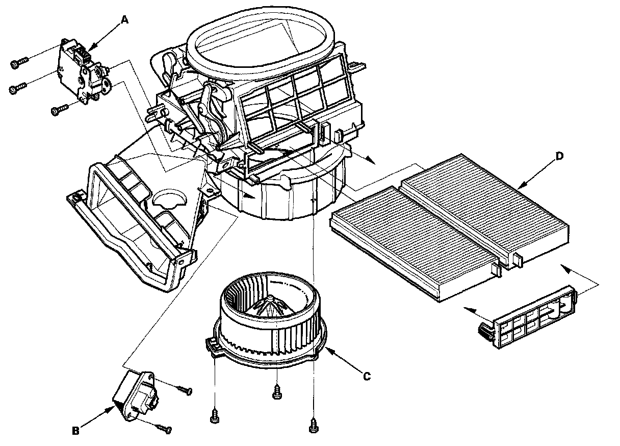 - The recirculation control motor (A), the power transistor (B), the blower motor (C), and the dust and pollen filters (with A/C) (D) can be replaced without removing the blower unit.