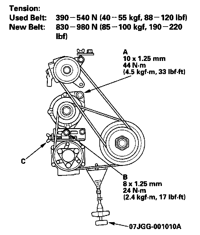 5. If you installed a new belt, run the engine for 5 minutes, then readjust the belt to the used belt specification.