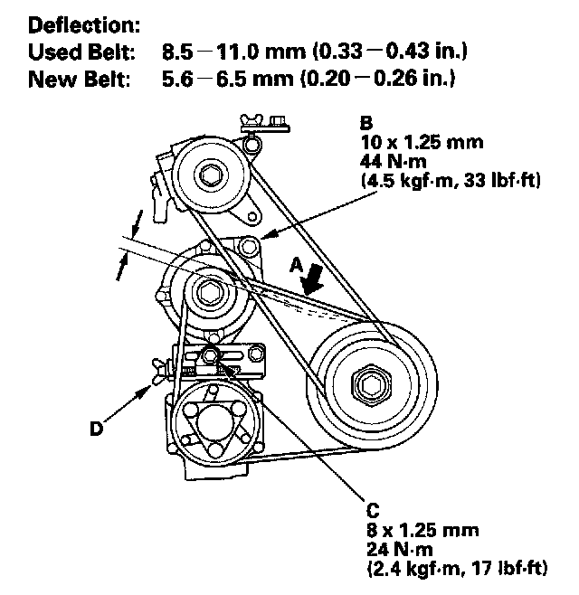 1. Apply a force of 98 N (10 kgf, 22 lbf), and measure the deflection at the mid point (A) between the alternator and crankshaft pulley. If the belt is worn or damaged, replace it. If the belt needs adjustment, go to step 2.