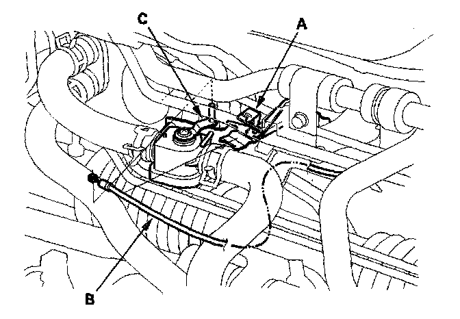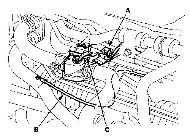 Heater Valve Cable Adjustment1. From under the hood, open the cable clamp (A), then disconnect the heater valve cable (B) from the heater valve arm (C).