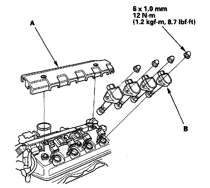 Remove the ignition coil cover (A), then remove the ignition coils (B).