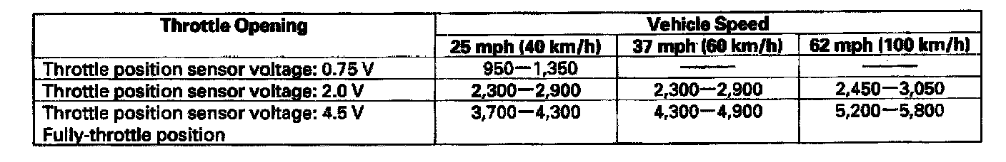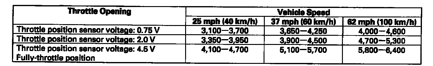 9. Test-drive the vehicle on a flat road in the position shown. While driving, check that the engine speeds meet the approximate vehicle speeds shown in the table.