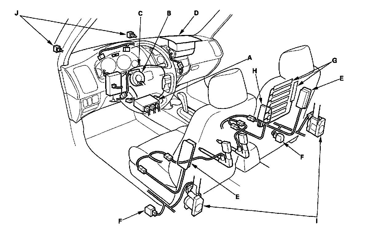 The SRS is a safety device which, when used with the seat belt, is designed to help protect the driver and front passenger in a frontal impact exceeding a certain set limit. The system consists of the SRS unit, including safing sensor and impact sensor (A), the cable reel (B), the driver's airbag (C), the front passenger's airbag (D), side airbags (E), seat belt tensioners (I), and front impact sensors (J).