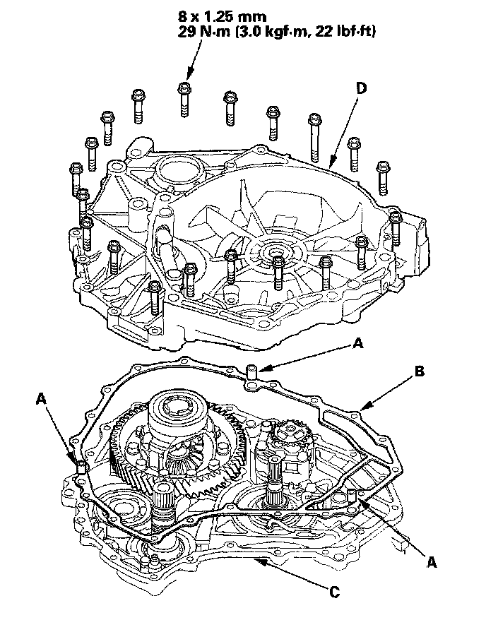 5. Install the housing bolts (20 bolts), and tighten the bolts in two or more steps to 29 Nm (3.0 kgf-cm, 22 ft. lbs.) in a crisscross pattern.
