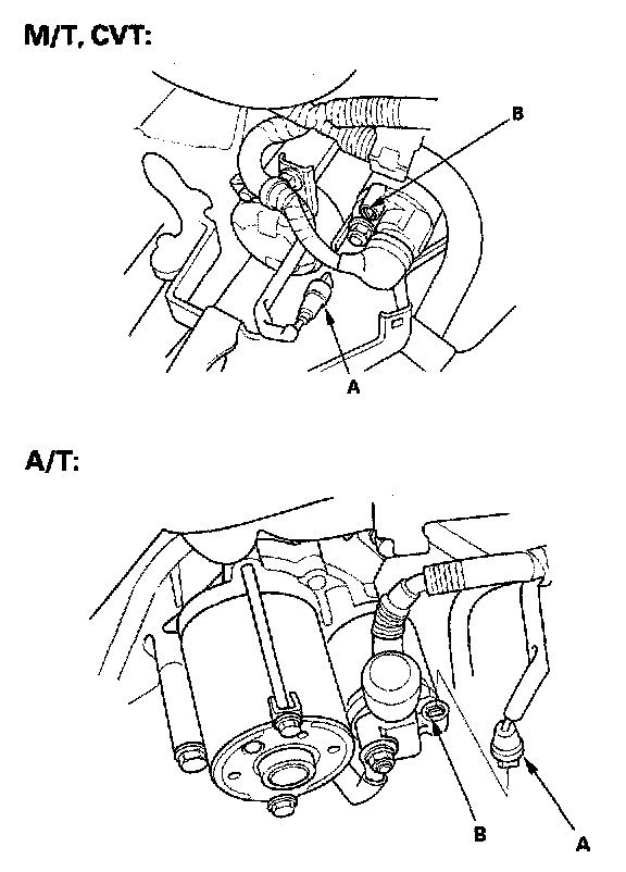 5. Make sure the transmission is in [N] or [P] (A/T, CVT), or neutral (M/T), then disconnect the BLK/WHT wire (A) from the starter solenoid (B). Connect a jumper wire from the battery positive terminal to the solenoid terminal.
