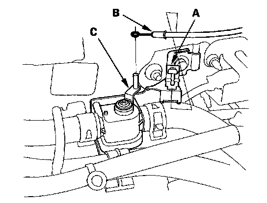 Heater Valve Cable Adjustment1. From under the hood, open the cable clamp (A), then disconnect the heater valve cable (B) from the heater valve arm (C).