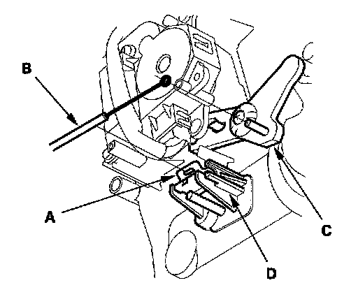 4. Attach the heater valve cable (B) to the air mix control linkage (C) as shown above. Hold the end of the heater valve cable housing against the stop (D), then snap the heater valve cable housing into the cable clamp (A).