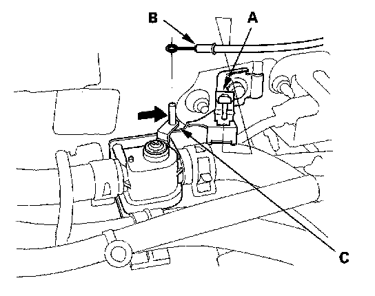 5. From under the hood, turn the heater valve arm (C) to the fully closed position as shown, and hold it. Attach the heater valve cable (B) to the heater valve arm, and gently pull on the heater valve cable housing to take up any slack, then install the heater valve cable housing into the cable clamp (A).